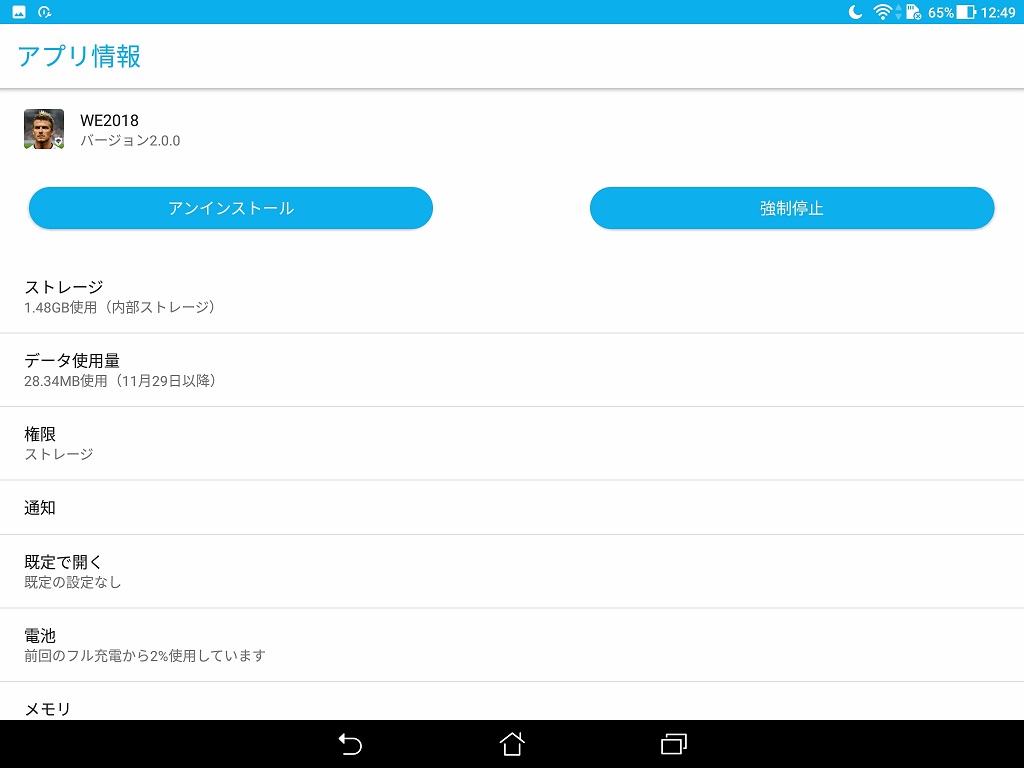 ホーム画面などにある「設定」から“アプリ”の項目を開き、その中にある“WE2018”(日本語以外は“PES2018”)をタップすると画像のような「アプリ情報」が表示されます。“データを削除(消去)”というのがあればそれをタップして完了、無い場合は「ストレージ」をタップすると表示されます。