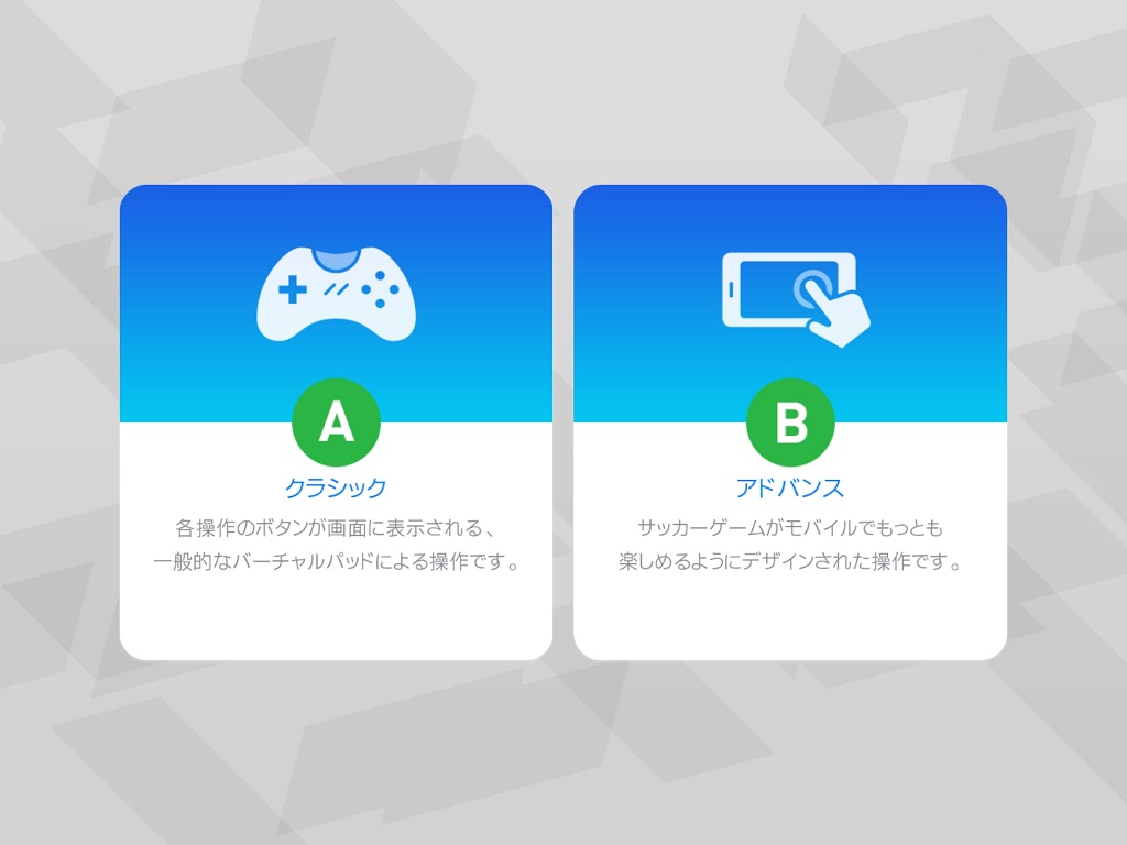 「アドバンス」は、フリックでパスの方向を決めるなど、スマートフォンやタブレットに合った操作ができるのが特徴です。PS版をやったことがない人や、フリックで操作するアプリゲームをよくやる人は、こちらが向いているかもしれません。