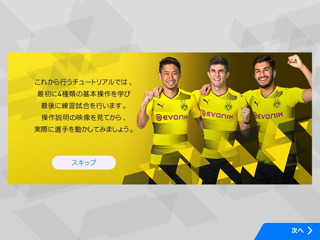 操作方法を決めた後、パスやシュートなどのやり方を教えてくれるチュートリアルが出来ますが、一度始めると途中でやめることが出来ず時間もかかってしまうので注意してください。