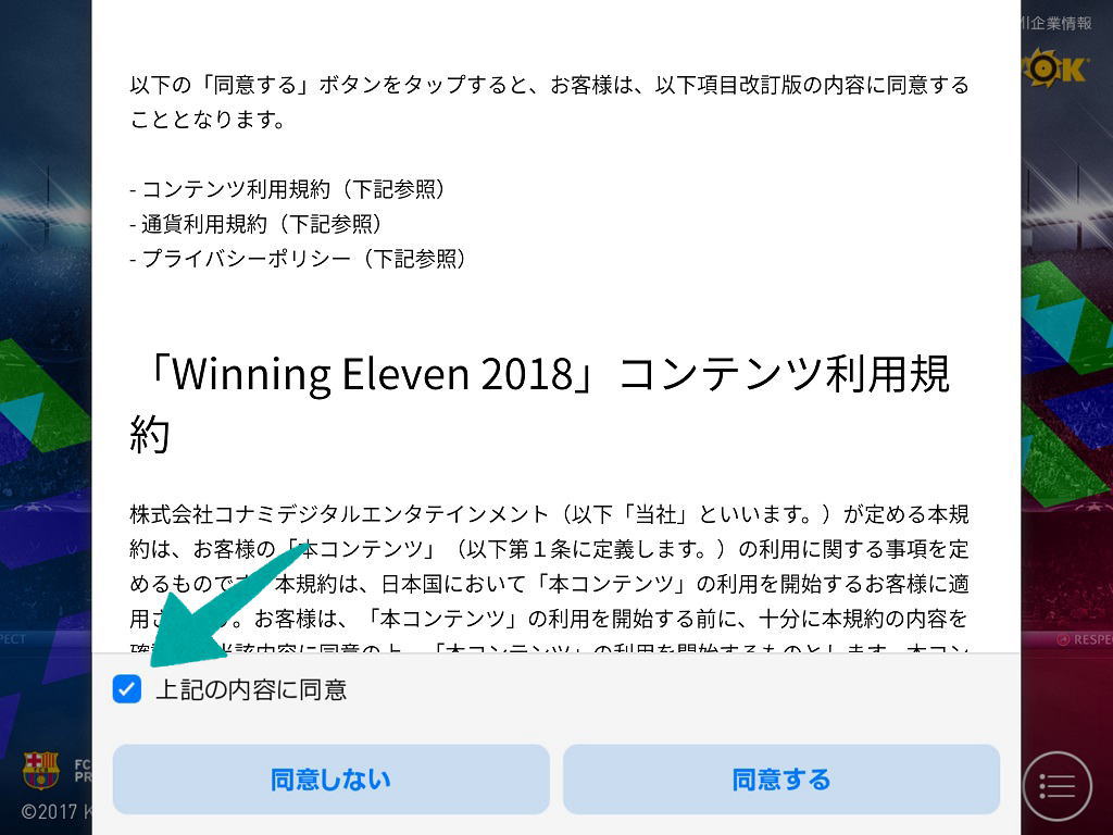 理解したら「上記の内容に同意」の左にある□と「同意する」をタップします。