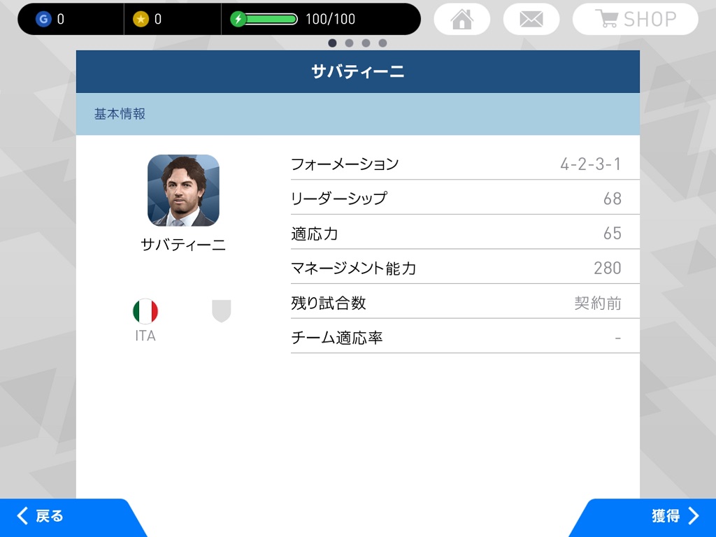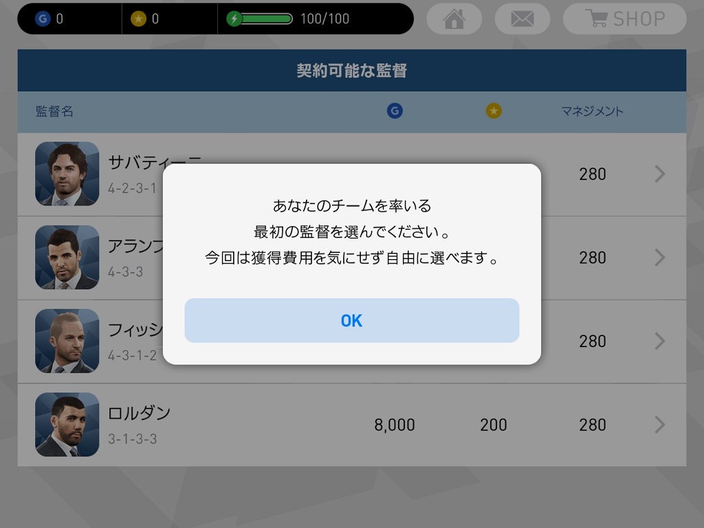 ここではチームを指揮する監督を決めます。通常は監督の能力に応じた額のGPもしくはmyClubコインが必要ですが、初回だけ獲得費用を払わず契約できます。
