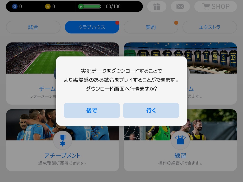 実況データをダウンロードするか尋ねられますが、後からダウンロードすることも出来るので、リセマラなら「後で」を選びましょう。
