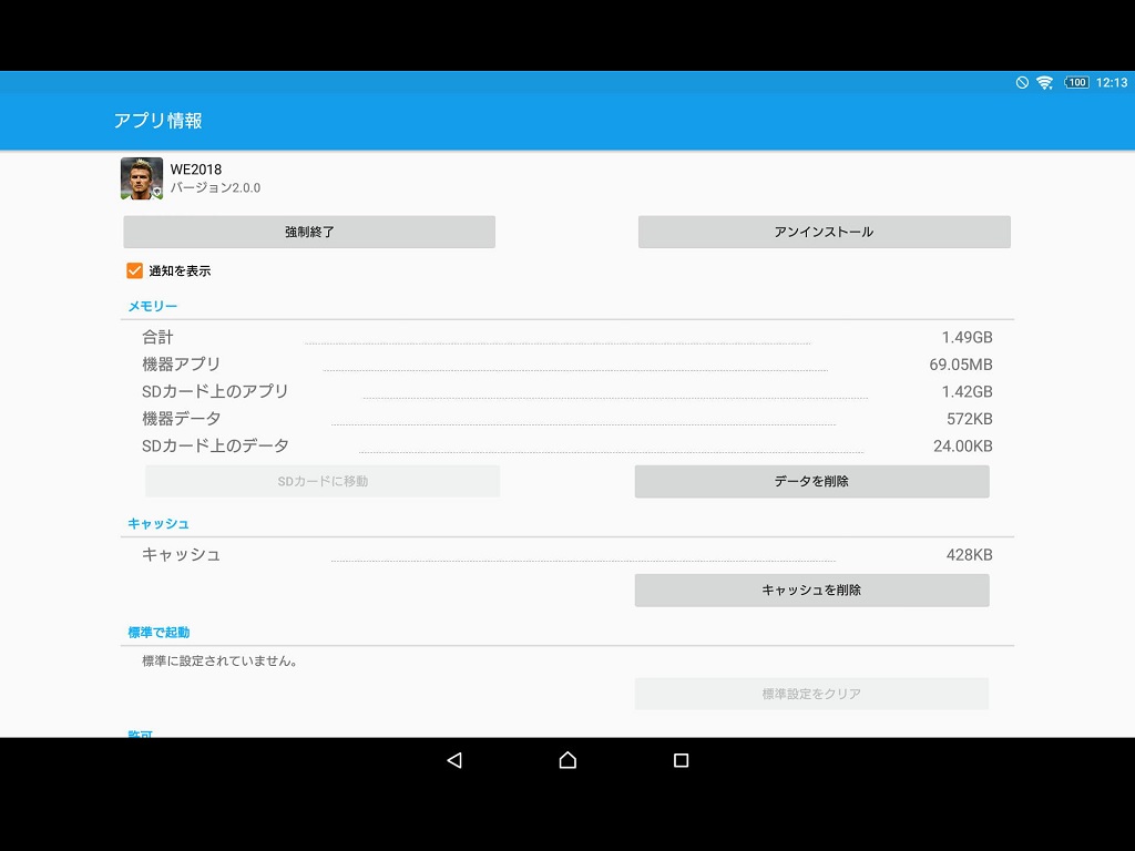 ホーム画面などにある「設定」から“アプリ”の項目を開き、その中にある“WE2018”(日本語以外は“PES2018”)をタップすると画像のような「アプリ情報」が表示されます。“データを削除(消去)”というのがあればそれをタップして完了、無い場合は「ストレージ」をタップすると表示されます。